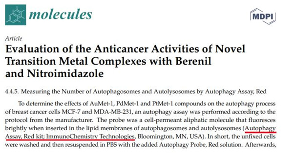 ImmunoChemistry自噬检测试剂盒,其试剂盒中的红色自噬探针是一种可以穿透细胞的脂肪族分子,当插入自噬体和自溶酶体的脂膜时发出明亮的荧光。该红色自噬探针可以通过流式细胞仪检测。